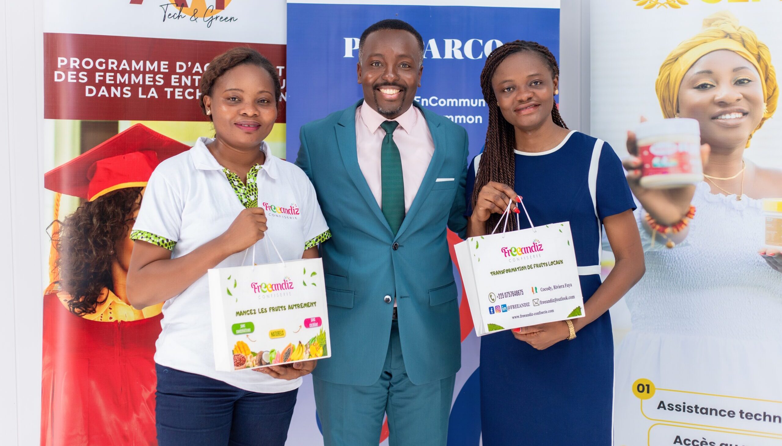 structuration d’équipe et de stratégie commerciale. Puis nous avons participé au programme AWF cohorte 10 et avons reçu un accompagnement technique de la Fondation SEPHIS, renforcé par le Prix PROPARCO qui nous a permises de professionnaliser notre activité. Freeandiz Confiserie est présente Aujourd’hui chez Auchan et à bord des vols Air Côte d’Ivoire, avec une ambition affirmée de rayonnement national et international.